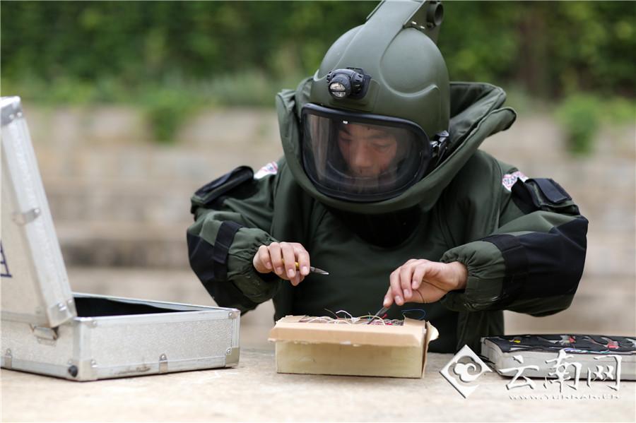 Several soldiers in the People's Armed Police Yunnan General Corps receive rigorous psychological trainings and trainings on how to use the professional equipment before they are capable of safely disposing of explosives. (Photo/Yunnan.cn)