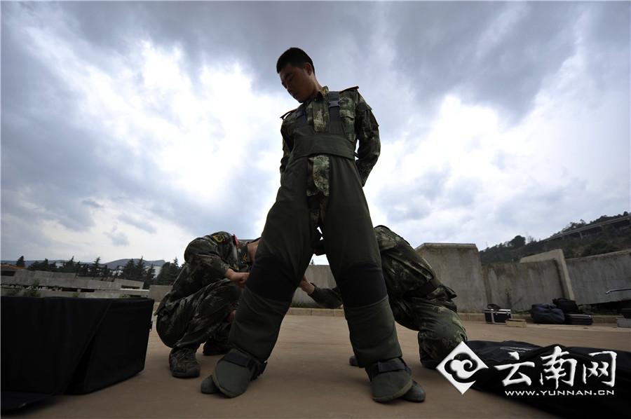 | Several soldiers in the People's Armed Police Yunnan General Corps receive rigorous psychological trainings and trainings on how to use the professional equipment before they are capable of safely disposing of explosives. (Photo/Yunnan.cn) |