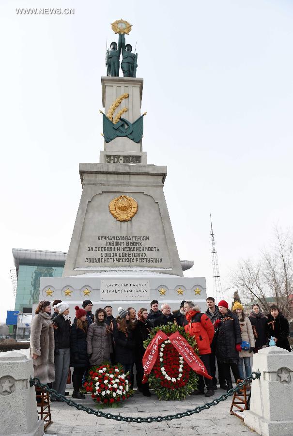 Representatives of Russians living in Harbin, capital of northeast China's Heilongjiang Province, pose for a group picture after laying flowers at Soviet martyrs monument in Harbin, Feb. 28, 2015. Dozens of Russians living and working in Harbin attended a commemorative activity for Soviet Red Army soldiers who sacrificed during World War II on Saturday. The monument was set up in 1945 to commemorate Soviet soldiers who were killed in the fight against the Japanese invaders in China. (Xinhua/Wang Jianwei) |