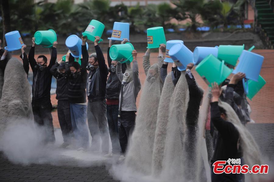 Employees of a scenic spot dump sands on themselves during an event to raise awareness of energy saving and environmental protection in Fuling, Southwest China's Sichuan province, Mar. 1, 2015. (Photo: China News Service/Chen Chao)