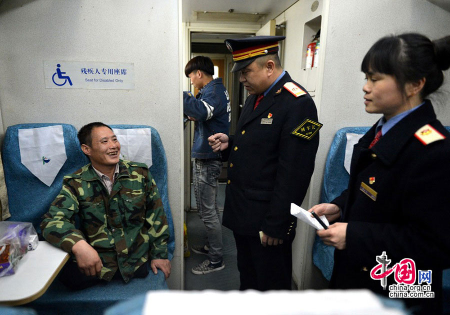 The conductor of the train talks with Teng Xingguo. (China.com.cn/Cao Feng)