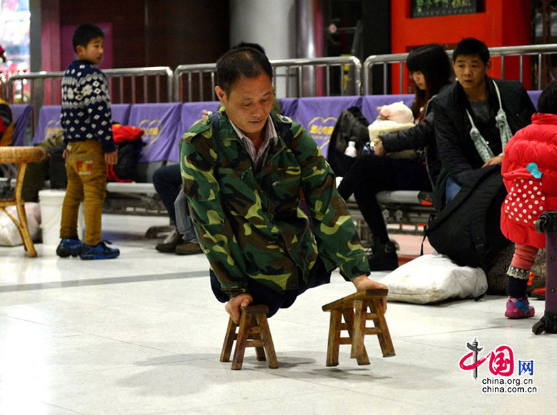 Teng Xingguo, an amputee man of Sichuan province, wanted to arrive at his work place in Henan Province by train. It was not easy for Teng, who relied on two small wooden stools to move forward. But with the help of several warm-hearted persons, he had a warm journey.