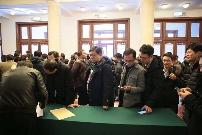 Chinese mainland journalists and reporters line up to pick up press cards for the third session of the 12th National People's Congress (NPC) and the third session of the 12th Chinese People's Political Consultative Conference (CPPCC) on March 1, 2015. More than 3,100 journalists will participate in reporting the two sessions. (Photo/ gmw.cn)