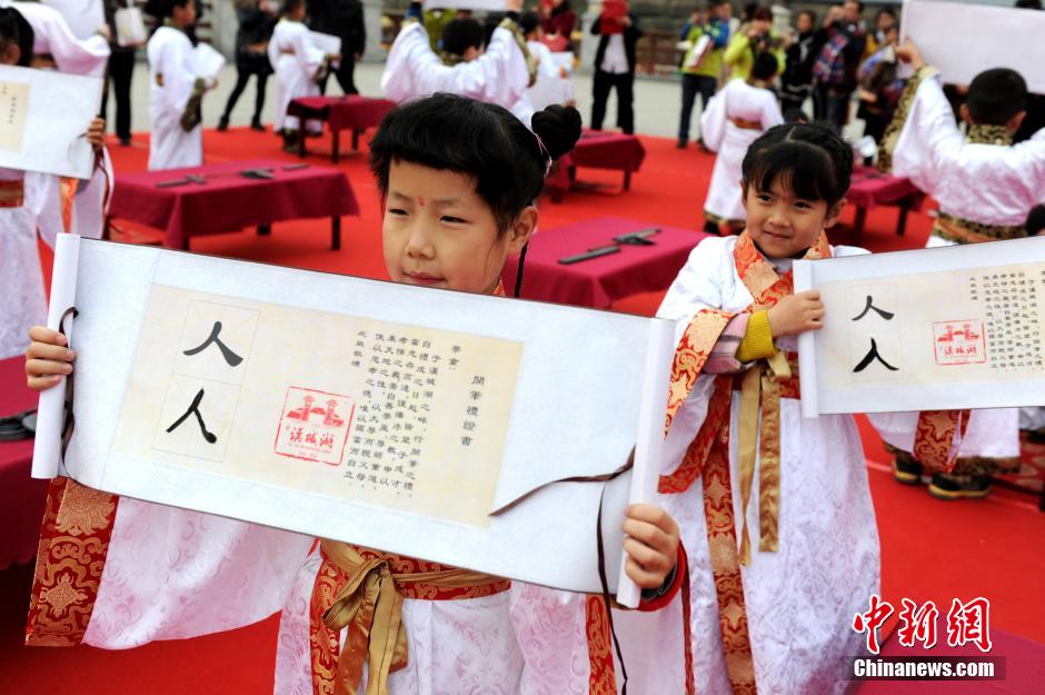 On March 1, 2015, 50 schoolchildren are dressed in China’s Han costume for their “First Writing Ceremony” by a lake in Xi’an, Shaanxi province. The First Writing Ceremony, also called Qi Meng (literally Enlightenment) Ceremony, is a very important traditional ceremony for every student before they were admitted to school. (Photo/ Zhang Yuan) |