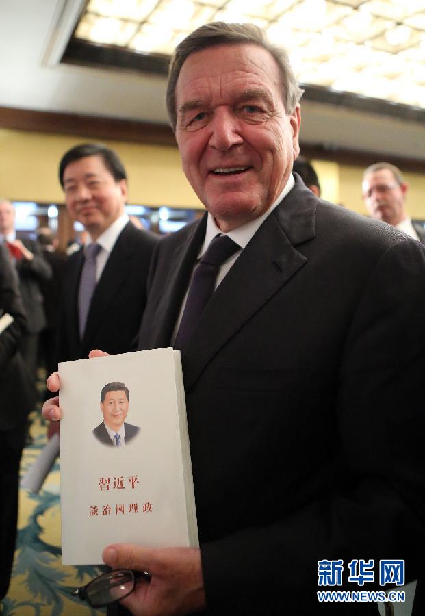 At Frankfurt Book Fair in Germany, the former Prime Minster of Germany Gerhard Fritz Kurt Schr?der holds the book, Oct. 8, 2014. (Xinhua/Luo Huanhuan) |