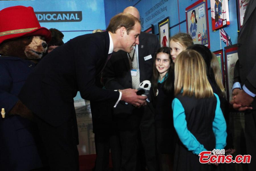 Britain's Prince William (L) receives a gift from a girl during the China premiere of the film "Paddington" at Shanghai Film Museum in Shanghai, March 3, 2015.(Photo: China News Service/ Zhang Hengwei)