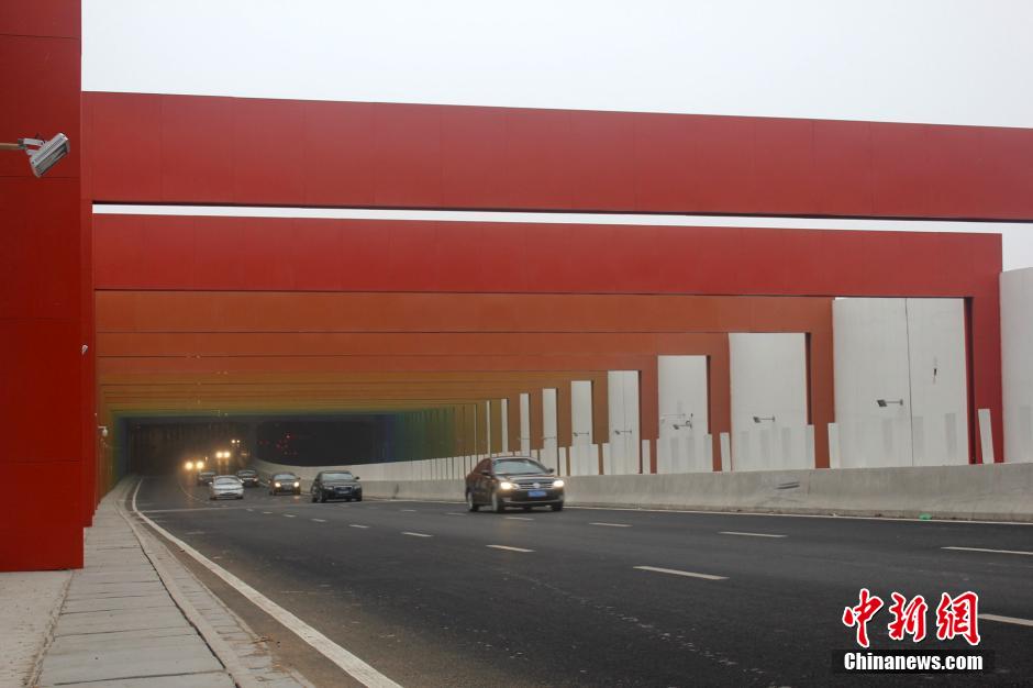 A 400-meter-long tunnel, the first of its kind in China, opens to traffic on March 1, 2015. From both ends to the middle section, the color changes from purple to blue to help drivers get used to the light change as they enter and exit the tunnel. (CNS/Ma Yiheng) |