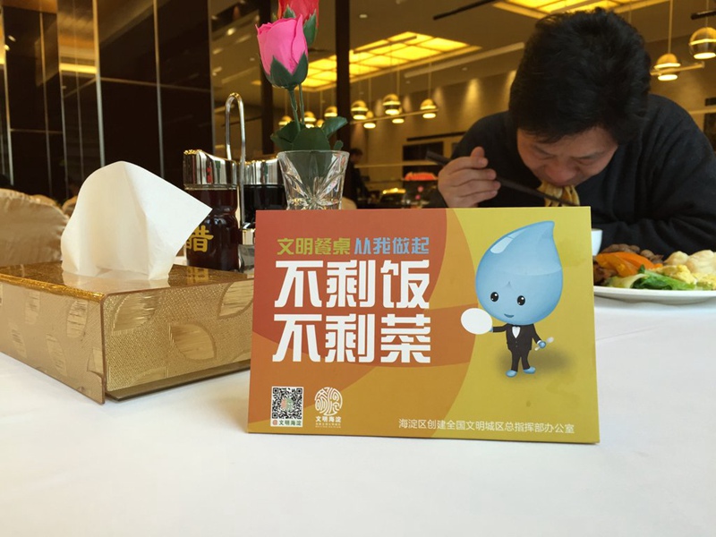 On each table, there is a sign that reads ‘do not waste food’ at the restaurant for NPC deputies and CPPCC members. (Photo/Jiang Xin)