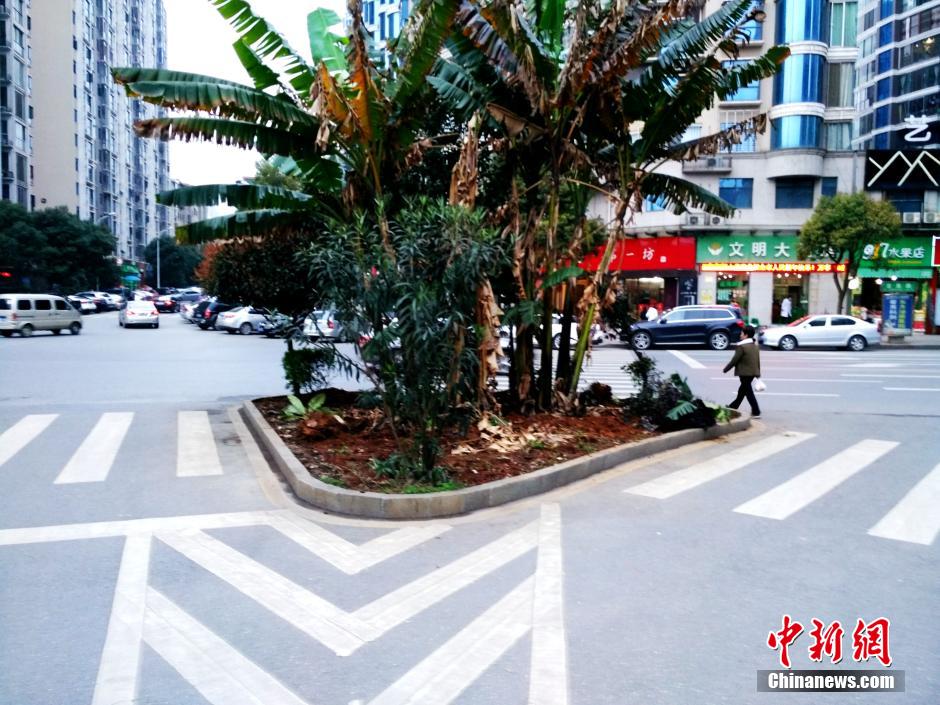 Instead of a refuge island, a parterre is built in the intersection of the three zebra crossings in the city of Chenzhou, central's China's Hunan province. Pedestrians complain that they have no place to stop after crossing the zebra crossings. (Photo/CNS)