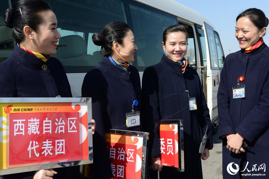 The stewards pose for photo at the Tiananmen Square in Beijing on Mar. 3 2015. Their warm smile become the beautiful landscape for the two sessions every year. (Photo/CFP)