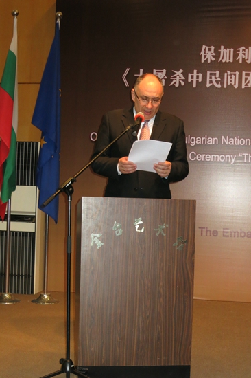 Bulgarian ambassador to China Plamen Shukyurliev delivers a speech at the opening ceremony of the exhibition. (Photo/Kong Defang)