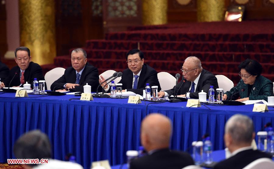 Zhang Dejiang (back, C), chairman of the Standing Committee of China's National People's Congress (NPC) and a member of the Standing Committee of the Political Bureau of the Communist Party of China (CPC) Central Committee, visits members of the 12th National Committee of the Chinese People's Political Consultative Conference (CPPCC) from the Hong Kong and Macao special administrative regions and joins their panel discussion in Beijing, capital of China, March 4, 2015. (Xinhua/Rao Aimin) |