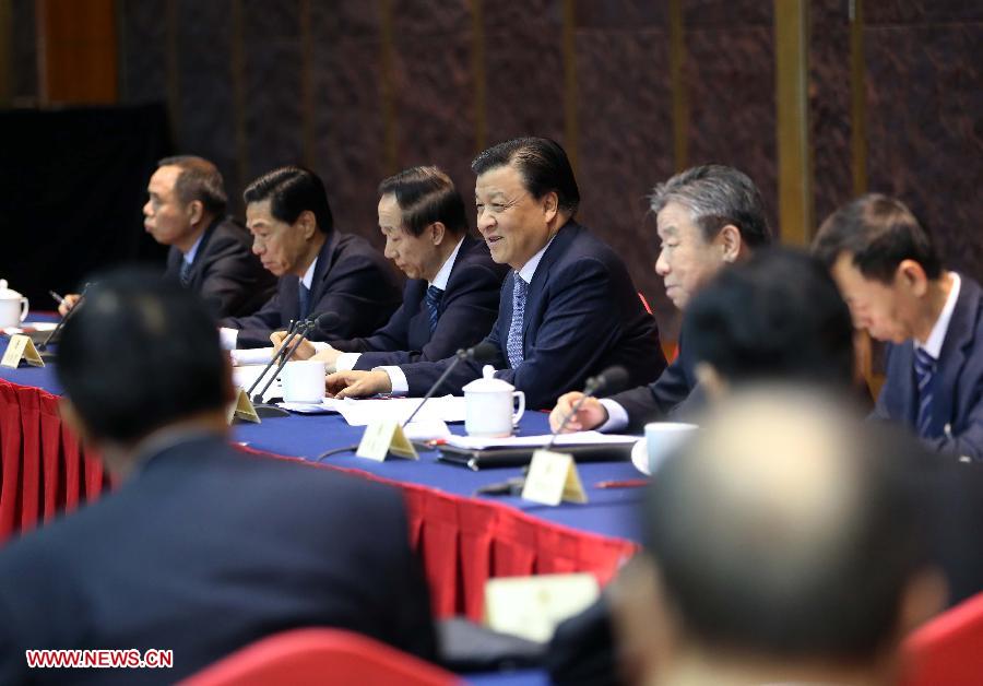 Liu Yunshan (3rd R, back), a member of the Standing Committee of the Political Bureau of the Communist Party of China (CPC) Central Committee and secretary of the Secretariat of the CPC Central Committee, visits members of the 12th National Committee of the Chinese People's Political Consultative Conference (CPPCC) from the All China Federation of Trade Unions and sectors of social welfare and security and joins their panel discussion in Beijing, capital of China, March 4, 2015. (Xinhua/Liu Weibing) |