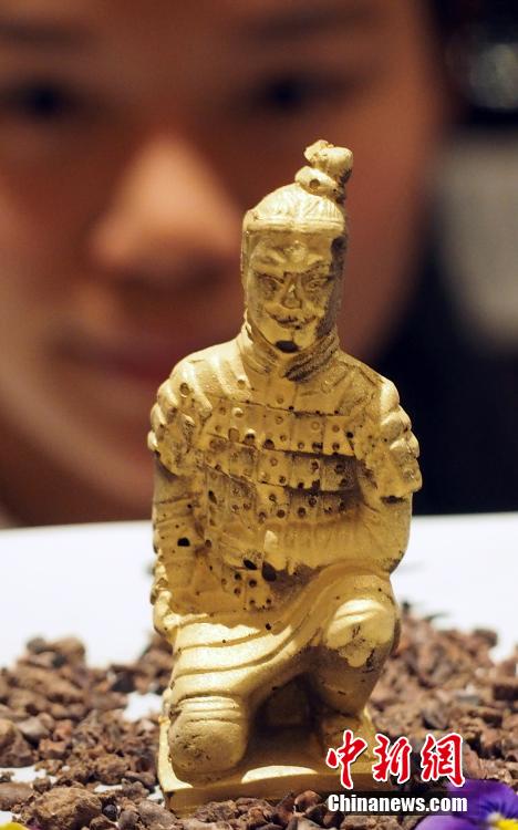 Chocolate Terracotta warriors and bolts are displayed at a reception held by the Sichuan chamber of commerce in Los Angeles on March 2, 2015. Those pieces of chocolate are made by Chinese master chef Yang Yong. (CNS/ Mao Jianjun)