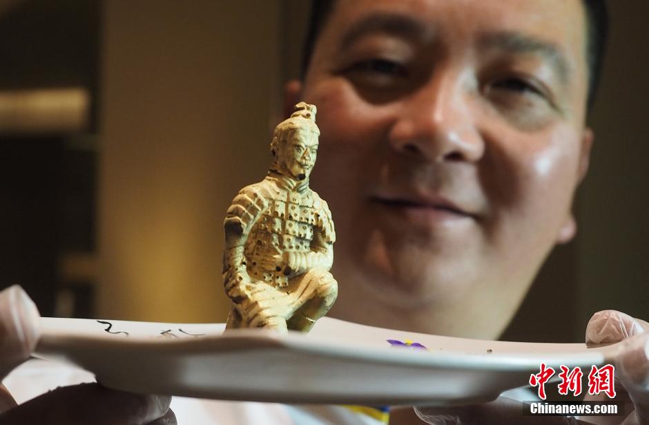 Chocolate Terracotta warriors and bolts are displayed at a reception held by the Sichuan chamber of commerce in Los Angeles on March 2, 2015. Those pieces of chocolate are made by Chinese master chef Yang Yong. (CNS/ Mao Jianjun)