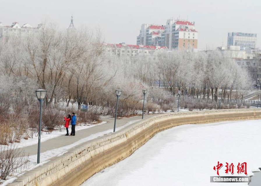 On March 3, 2015, beautiful rime turns the Songhua River into a fairyland in Jilin city, northeast China's Jilin province. (CNS/Wang Mingming)