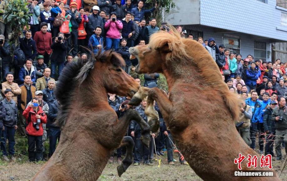 A horse fighting competition is held to celebrate the upcoming Lantern Festival in Rongshui Miao Autonomous County in southwest China's Guangxi on March 3, 2015. The horse fighting competition has a history of 500 years. It was originally set for ruling marriage dispute, and later became an entertainment for local people. (Photo/CNS)
