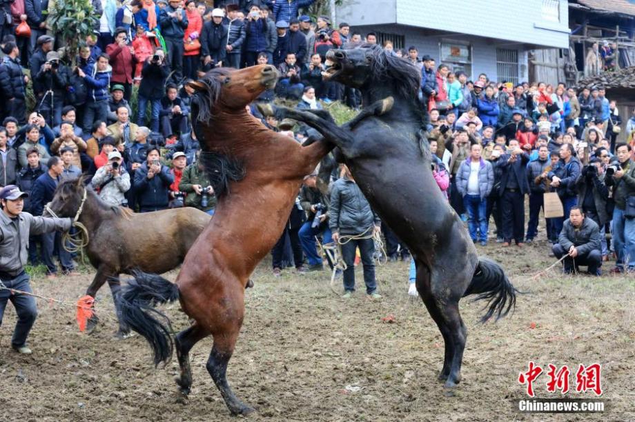 A horse fighting competition is held to celebrate the upcoming Lantern Festival in Rongshui Miao Autonomous County in southwest China's Guangxi on March 3, 2015. The horse fighting competition has a history of 500 years. It was originally set for ruling marriage dispute, and later became an entertainment for local people. (Photo/CNS)