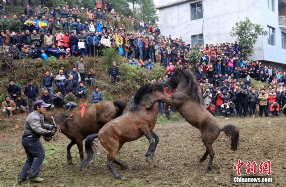 A horse fighting competition is held to celebrate the upcoming Lantern Festival in Rongshui Miao Autonomous County in southwest China's Guangxi on March 3, 2015. The horse fighting competition has a history of 500 years. It was originally set for ruling marriage dispute, and later became an entertainment for local people. (Photo/CNS)