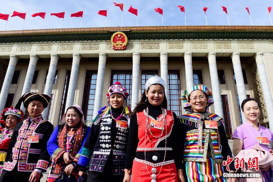 NPC deputies from ethnic minority groups wear costumes unique to their ethnicity to attend the preparatory meeting for the third session of the 12th NPC. (CNS/Chen Wen)