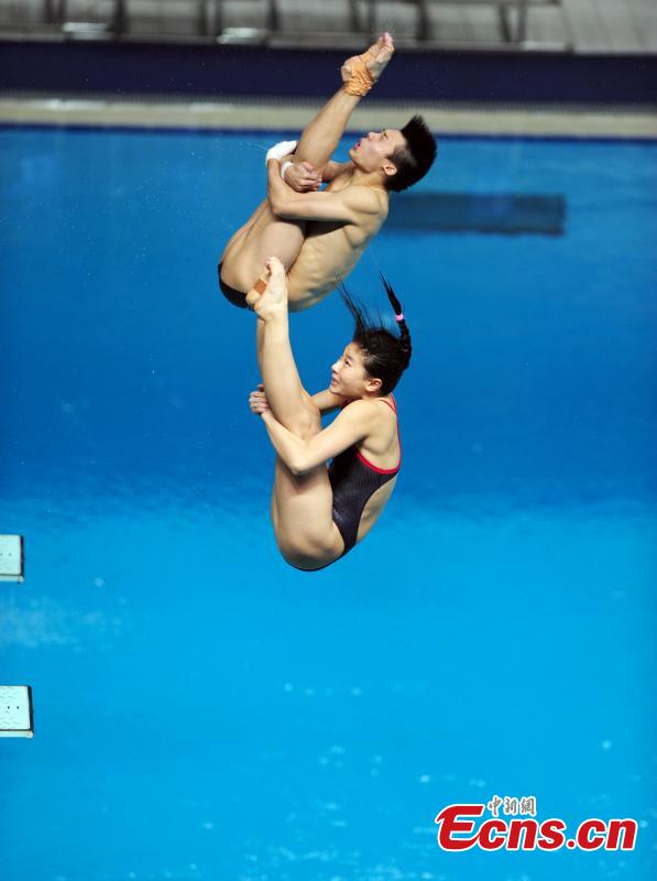 He Zi and Chen Aisen compete in the mixed synchronized 3m springboard final during the China Diving Championships in Wuhan, Central China’s Hubei province, March 6, 2015. The group wins the first place. The mixed synchronized events make their debut in the national championships. (Photo: China News Service/Zhang Chang) |