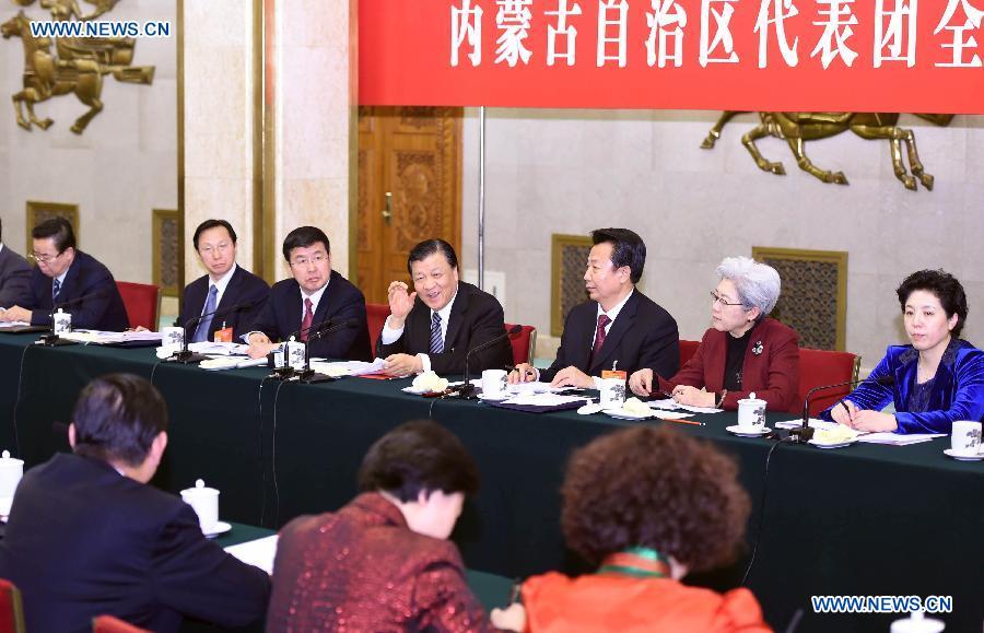 Liu Yunshan (back C), a member of the Standing Committee of the Political Bureau of the Communist Party of China (CPC) Central Committee and secretary of the Secretariat of the CPC Central Committee, joins a panel discussion of deputies to the 12th National People's Congress (NPC) from north China's Inner Mongolia Autonomous Region, in Beijing, capital of China, March 5, 2015. (Xinhua/Gao Jie) |