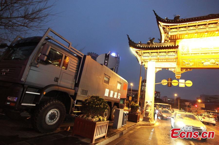 A high-tech vehicle is deployed to supervise visitors' flows near the Yuyuan Garden in Shanghai, March 5, 2015. To ensure the safety of visitors on the Lantern Festival, authorities in Shanghai have strengthened supervision of gatherings near local scenic spots. (Photo/Zhang Hengwei) |