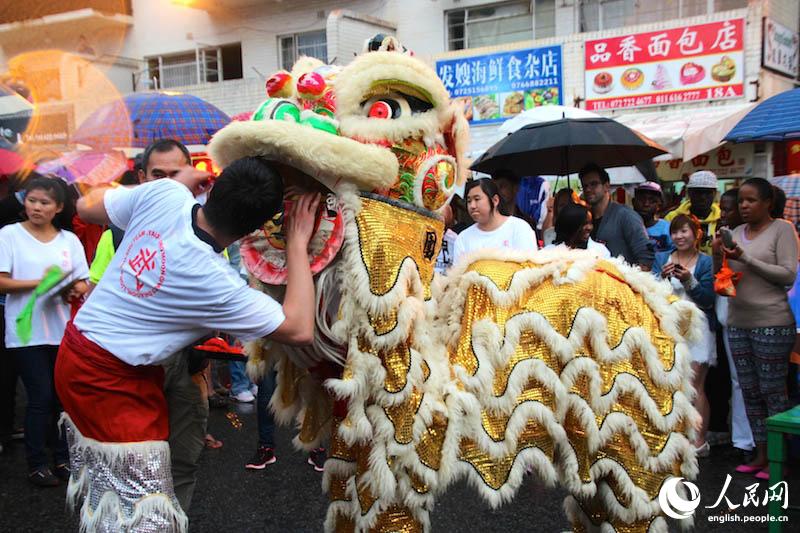The Dragon Dance team maneuvers to perform on the slippery road. (People's Daily Online/ Zhang Jiexian)