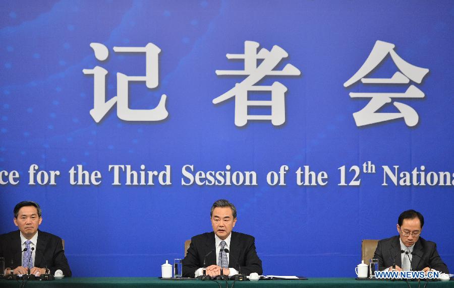 Chinese Foreign Minister Wang Yi (C) gives a press conference for the third session of China's 12th National People's Congress (NPC) in Beijing, capital of China, March 8, 2015. (Xinhua/Li Xiang)
