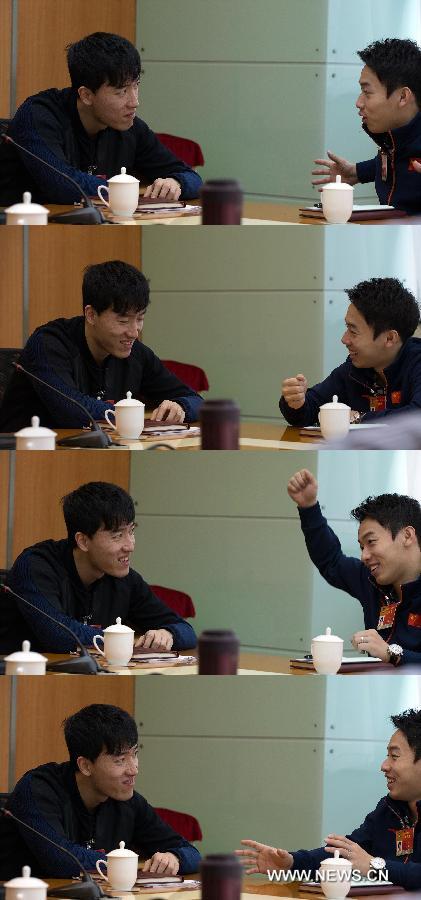 The combination photo taken on March 8, 2015 shows athletes Liu Xiang (L) and Zou Kai, members of the 12th National Committee of the Chinese People's Political Consultative Conference (CPPCC), discuss on sports reform at the intervals of the third session of the 12th CPPCC National Committee in Beijing, capital of China. (Xinhua/Cai Yang) |