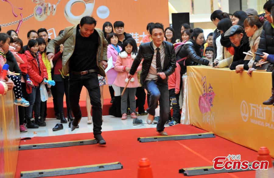 Men wearing pairs of women's high heels compete in an obstacle race at a shopping mall in Fuzhou, East China’s Fujian province, March 8, 2015. International Women's Day on March 8 dates back to the beginning of the 20th Century and has been observed by the United Nations since 1975. The UN writes that it is an occasion to commemorate achievements in women's rights and to call for further change. (Photo: China News Service/Lv Ming)