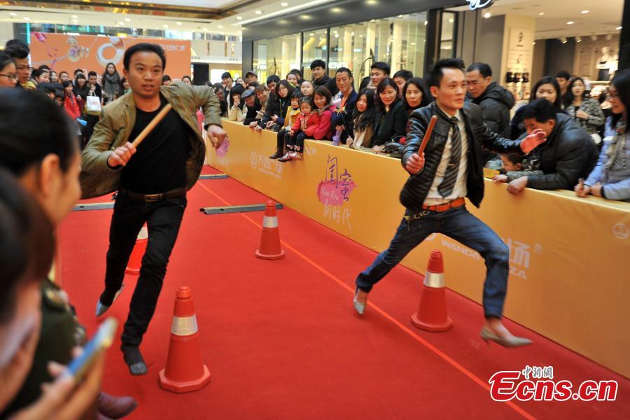 Men wearing pairs of women's high heels compete in an obstacle race at a shopping mall in Fuzhou, East China’s Fujian province, March 8, 2015. International Women's Day on March 8 dates back to the beginning of the 20th Century and has been observed by the United Nations since 1975. The UN writes that it is an occasion to commemorate achievements in women's rights and to call for further change. (Photo: China News Service/Lv Ming)