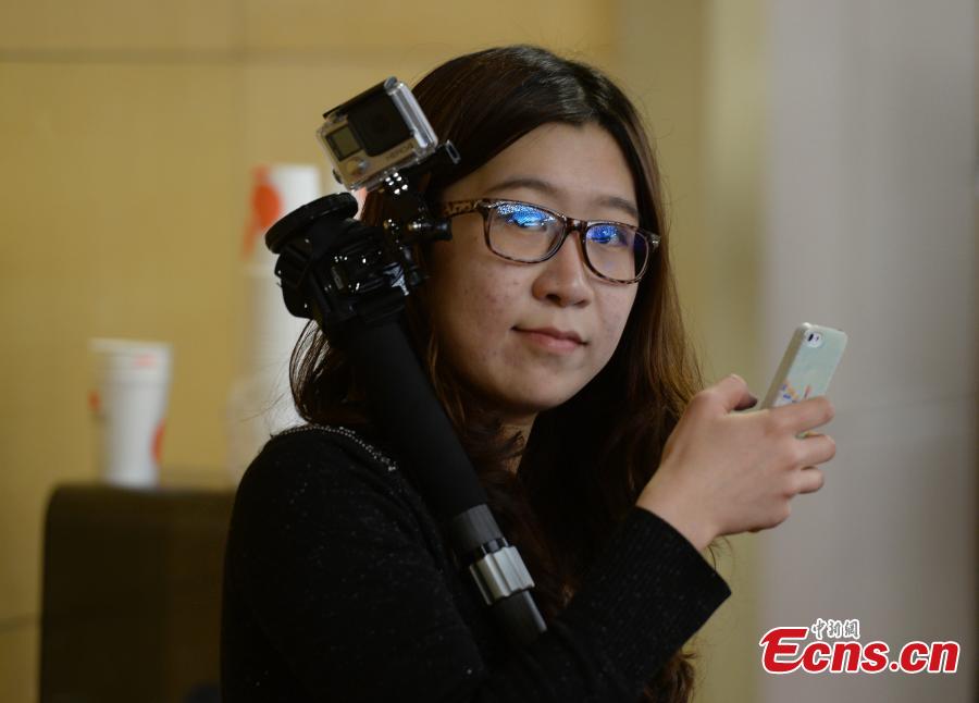 A well-equipped reporter attends a press conference during the Third Session of the 12th National People's Congress in Beijing, March 8, 2015. International Women’s Day is annually held on March 8 to celebrate women’s achievements throughout history and across nations. (Photo: China News Service/Hou Yu) |