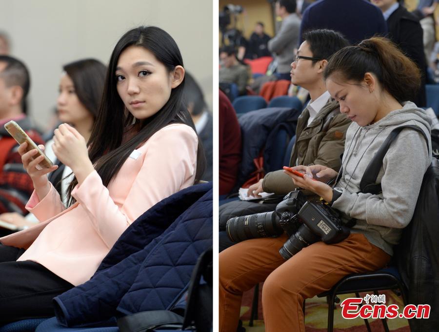 A combo shows female reporters at a press conference of the Third Session of the 12th National People's Congress in Beijing, March 8, 2015. International Women’s Day is annually held on March 8 to celebrate women’s achievements throughout history and across nations. (Photo: China News Service/Hou Yu) |