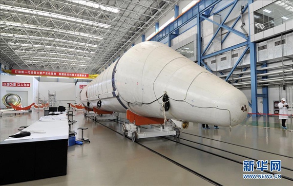Staff members examine the Long March-5 rocket in progress. Photo was taken on Dec 12, 2014. (Xinhua/ Yue Yue)