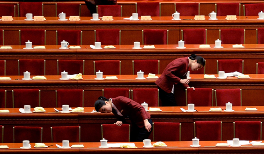 Two staff members check the venue after the opening ceremony of the third session of the 12th National Committee of the Chinese People's Political Consultative Conference (CPPCC), which was held in Beijing on March 3, 2015. (AFP/WANG ZHAO)