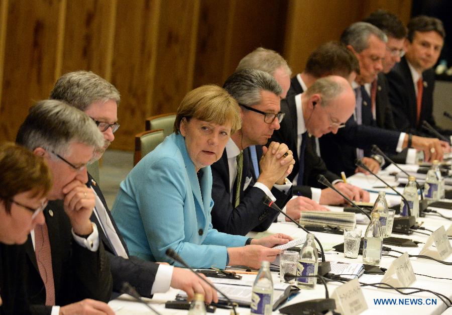 Germany's Chancellor Angela Merkel (4th L) and Japan's Prime Minister Shinzo Abe (not pictured) take part in a meeting with German and Japanese business leaders in Tokyo, Japan, March 9, 2015. (Xinhua/Ma Ping) |