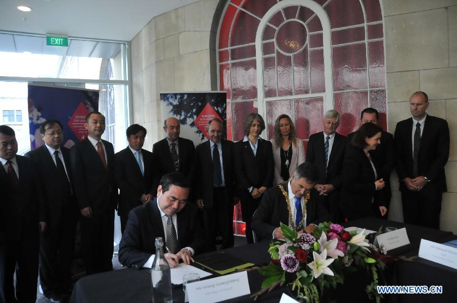 Wang Guangzheng (Front, L), vice mayor of China's Qingdao and Dave Cull (Front, R), mayor of New Zealand's Dunedin, sign a formal Friendship City Agreement in Dunedin, March 11, 2015. Dunedin, the South Island's second largest city and also one of New Zealand's major technology and education powerhouses, is consolidating its city links with China's eastern seaboard. (Xinhua/Su Liang) |
