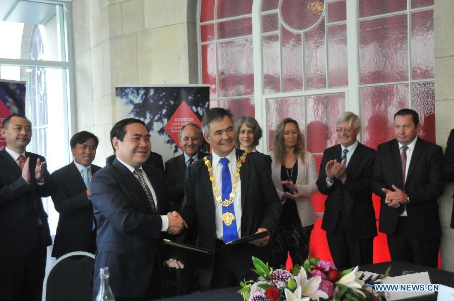 Wang Guangzheng (Front, L), vice mayor of China's Qingdao, shakes hands with Dave Cull (Front, R), mayor of New Zealand's Dunedin, as they exchange the copies of Friendship City Agreement in Dunedin, March 11, 2015. Dunedin, the South Island's second largest city and also one of New Zealand's major technology and education powerhouses, is consolidating its city links with China's eastern seaboard. (Xinhua/Su Liang) |