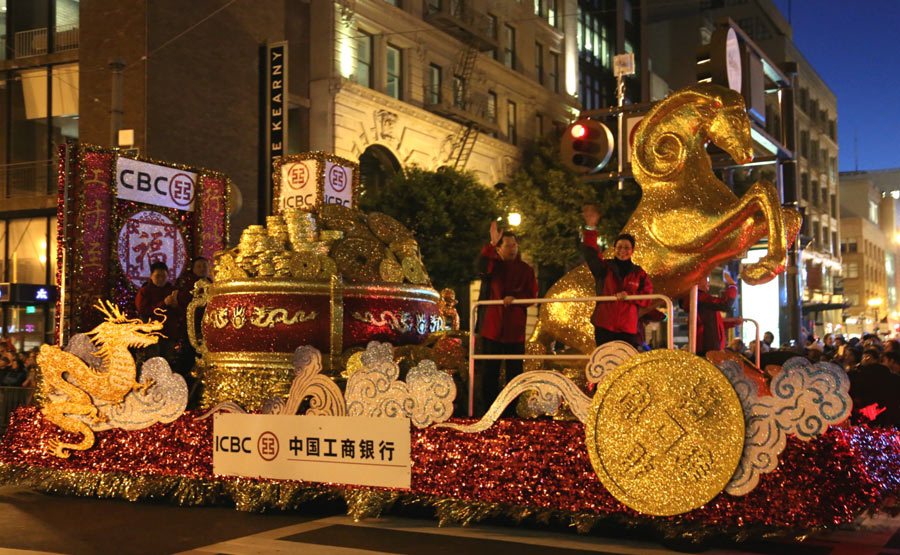The annual Chinese New Year Parade in San Francisco Chinatown is one of the largest across the country. Decorated floats, stilt walkers, dancing lions and dragons, Chinese acrobats as well as firecrackers all feed the 1.2 million audience with an authentic flavor of lunar new year celebration experience on March 7, 2015. (People’s Daily Online/Han Shasha)