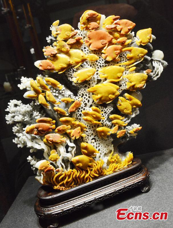 A Shoushan stone carving is on display in Fuzhou, East China’s Fujian province, March 10, 2015. The national and provincial masters present about 20 Shoushan stone carvings featuring a broad range of topics, such as Buddhist figures, in the exhibition. With a soft, smooth surface and various colors, Shoushan stone from a mountain called Shoushan in the province, is an ideal material for carving and is known as "the top grade-colored stone for carving." It is characterized by exquisiteness, smoothness, softness, and cohesion. (Photo: China News Service/Liu Kegeng) |