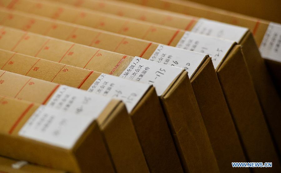 Photo taken on March 10, 2015 shows the filed original copies of motions in Beijing, capital of China. Among the 522 motions, 511 are about legislation and 8 are related to supervision. In addtion, 74.9 percent of the motions are accomplished by investigation, inspection, visit, discussion and etc. (Xinhua/Li Xiang) |
