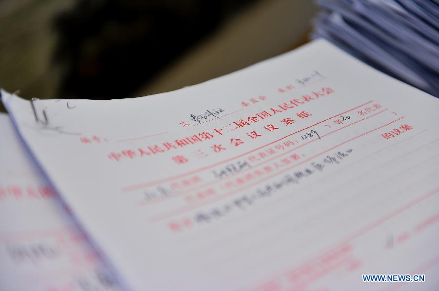 Photo taken on March 10, 2015 shows the the original copies of motions in Beijing, capital of China. Among the 522 motions, 511 are about legislation and 8 are related to supervision. In addtion, 74.9 percent of the motions are accomplished by investigation, inspection, visit, discussion and etc. (Xinhua/Li Xiang) |