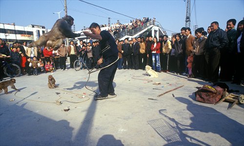 Several monkeys perform an acrobatic show. (Photo: Ma Hongjie)
