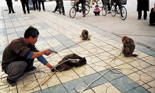 A busker playing cops and robbers with a monkey as part of their show. (Photo: Ma Hongjie)