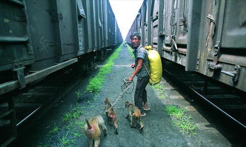 A decade ago, a busker and his monkeys sneak onto trains to avoid paying for tickets. (Photo: Ma Hongjie) |