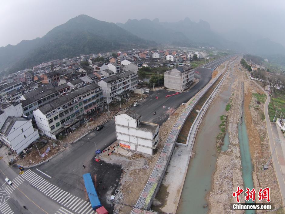 Two buildings block a provincial road in east China’s Zhejiang province. (CNS/Chang Kong)