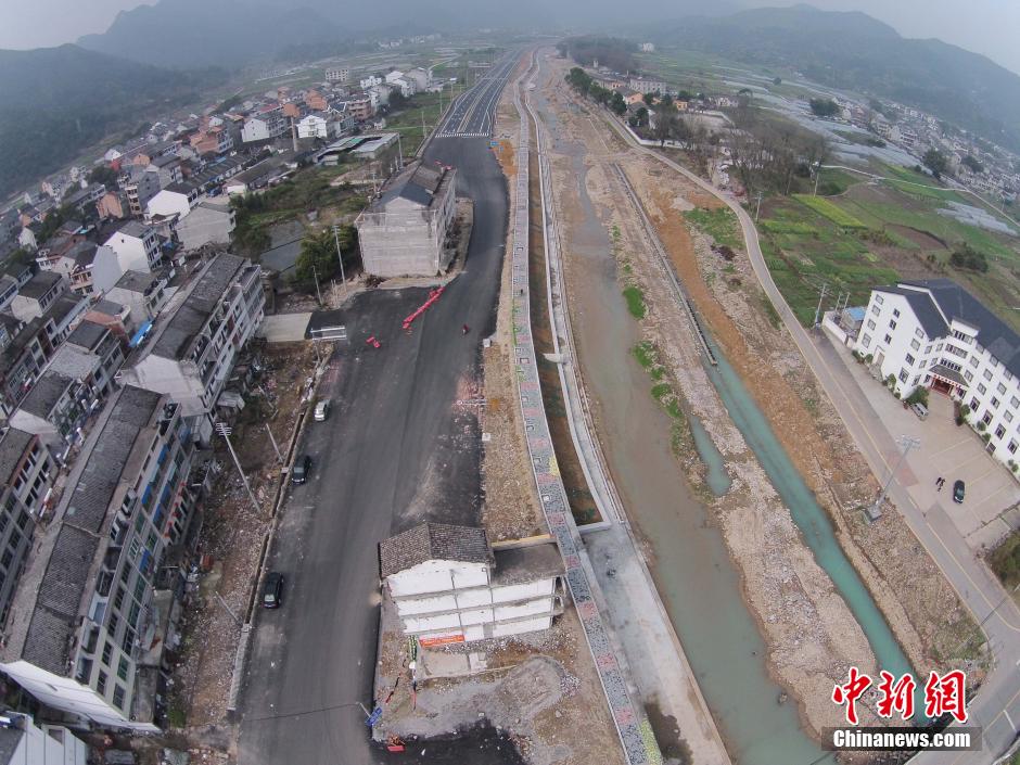 Two buildings block a provincial road in east China’s Zhejiang province. (CNS/Chang Kong)