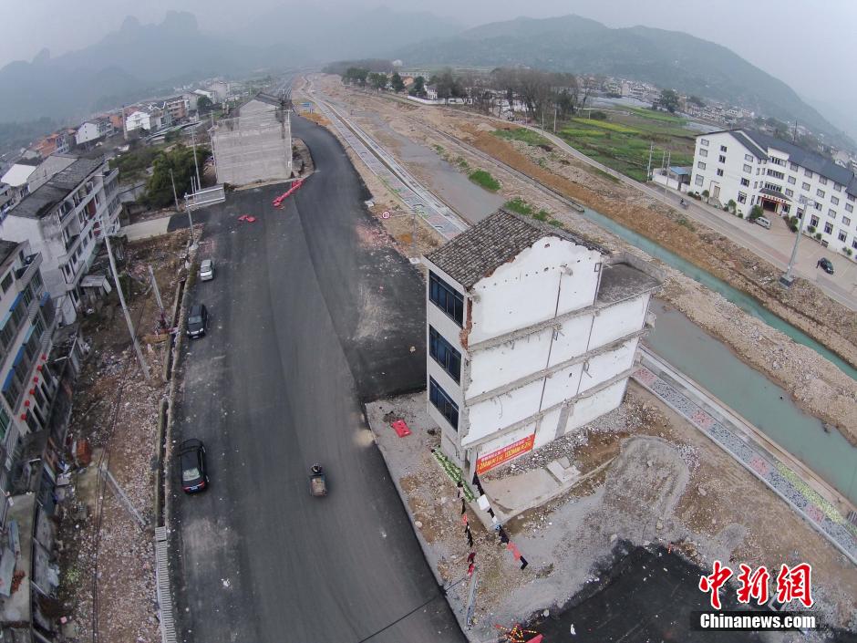 Two buildings stands in the center of a newly-built provincial road in east China's Zhejiang province, bringing safety risks to cars passing by.