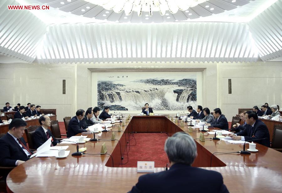 Zhang Dejiang (back, C), executive chairperson of the presidium of the third session of China's 12th National People's Congress (NPC) and chairman of the NPC Standing Committee, presides over the first meeting of the presidium's executive chairpersons at the Great Hall of the People in Beijing, capital of China, March 11, 2015. (Xinhua/Lan Hongguang) |